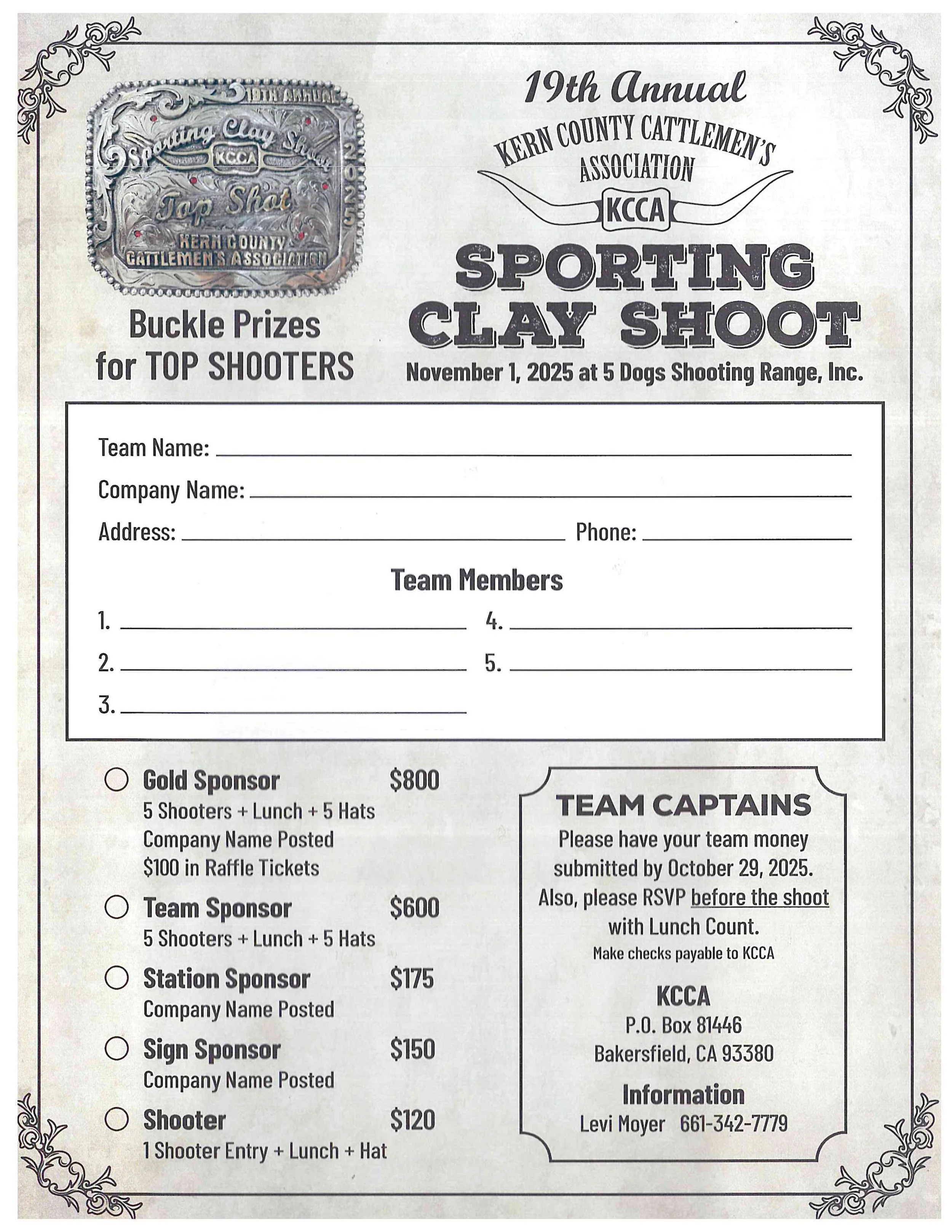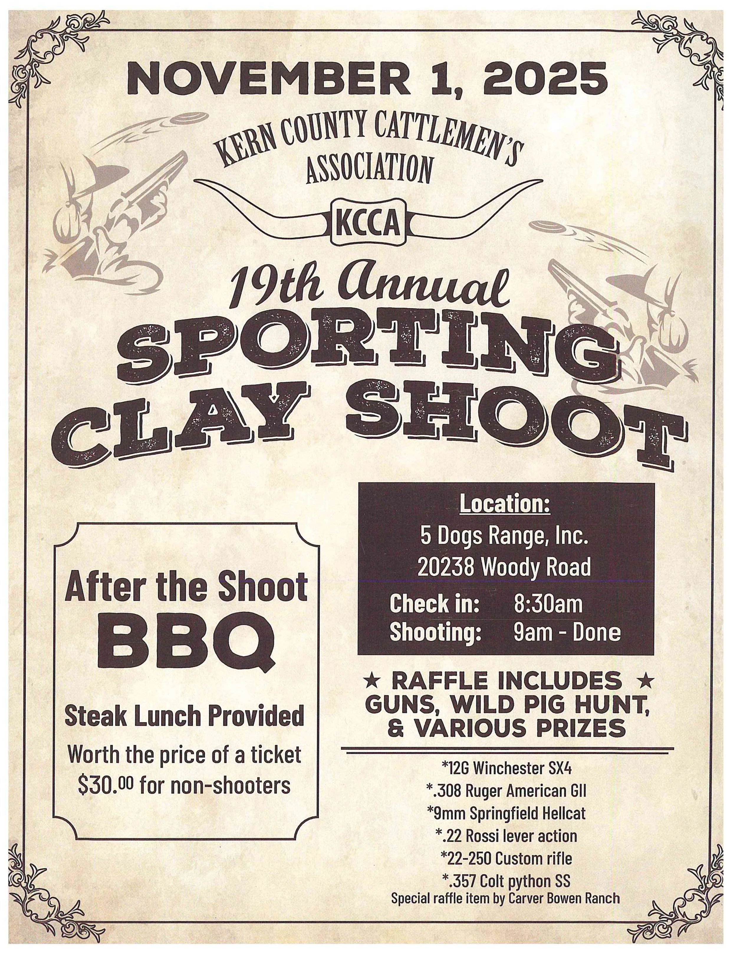 Kern County Cattlemen's Association Saturday, November 1, 2025 8:30 AM 1:00 PM 5 Dogs Range 20238 Woody Road Bakersfield, CA, 93308 United States (map) Google Calendar ICS Full Flyer